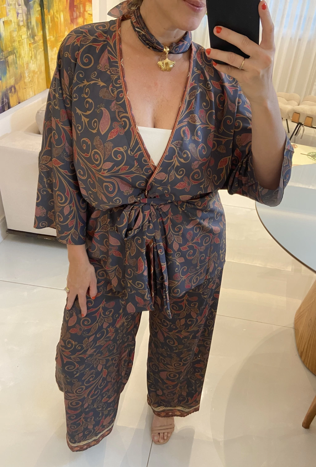 Conjunto calça pantalona e blusa Kafftan listrado náutico