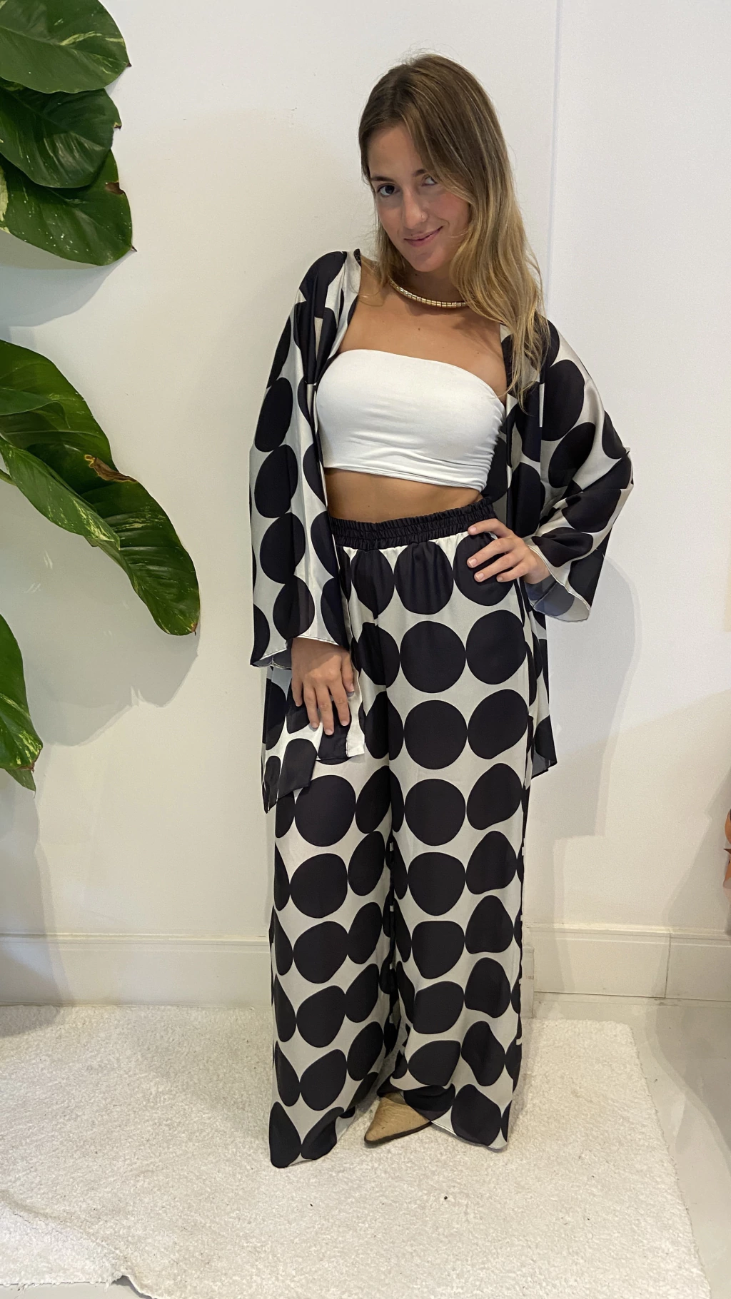 Clássico e atemporal, o conjunto em estampa geométrica branco e preto traz elegância e versatilidade ao look. Composto por calça pantalona e kimono, pode ser usado junto para um visual marcante ou separado, rendendo múltiplas combinações cheias de estilo.