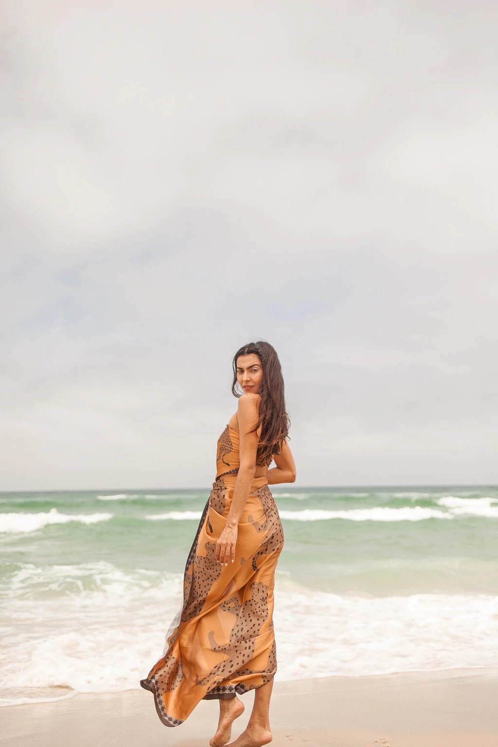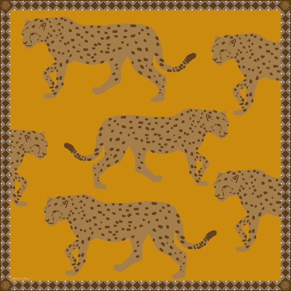 Lenço pareô animal print onças savannas andando dourado disponíveis em três tamanhos, 70x70 cm , 140x100 cm e 140x140 cm .