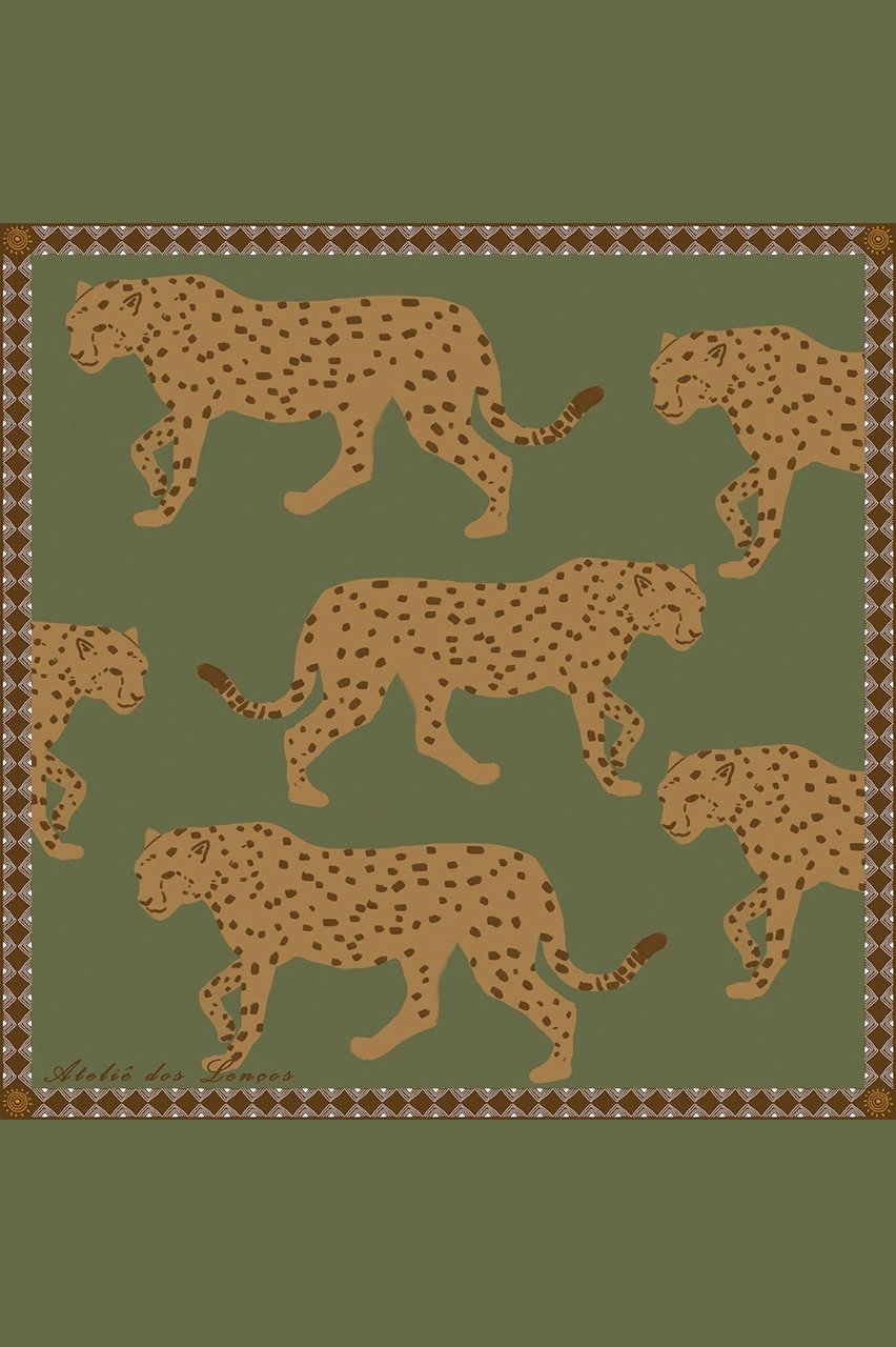 Lenço Pareô Onças Andando Verde Militar disponíveis em três tamanhos, 70x70 cm , 140x100 cm e 140x140 cm .